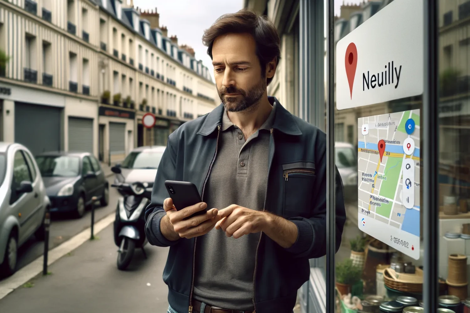 Local French shop owner worriedly checking Google search results for Neuilly-sur-Marne.